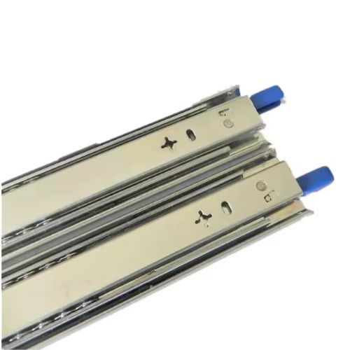 Corredera metálica de extracción total, largo 90 cm (900 mm), con traba para liberar el cajón fácilmente. Fabricada en acero galvanizado, ideal para cajones grandes y pesados. Soporta altas cargas y permite una apertura completa para un acceso total al contenido. Sistema de deslizamiento suave sobre rodamientos. Se instala lateralmente.