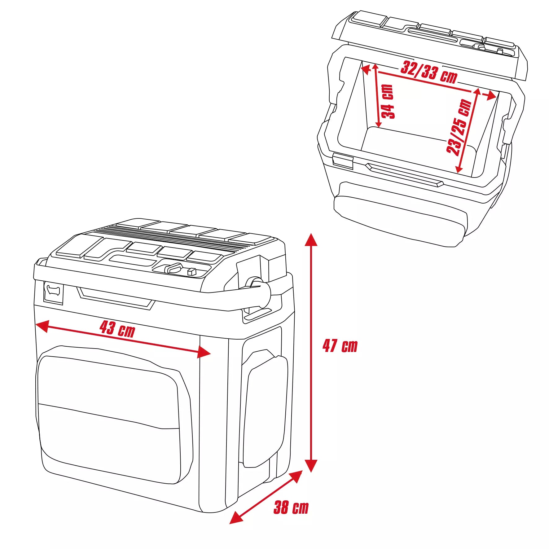 La nevera portátil TE-COL 18/27 Li-Solo de Einhell es un acompañante indispensable en tu día a día. Ya sean bebidas frías en verano o una comida caliente entre horas: la nevera portátil con batería es un imprescindible para excursiones en el tiempo libre, así como para el merecido descanso para almorzar en la obra. Es parte de la familia Einhell Power X-Change y, por lo tanto, se puede combinarse con cualquier batería de la serie del sistema. Al mismo tiempo se proporciona con un cable de 230 V y otro de 12 V. Dependiendo de la fuente de alimentación disponible, la nevera portátil selecciona automáticamente el funcionamiento. Por lo tanto, se puede preenfriar en casa en el enchufe y seguir enfriándola en el coche en el encendedor de cigarrillos. Para el funcionamiento de 12 V, la nevera portátil está equipada con una protección de batería del vehículo que evita una descarga profunda de la batería del vehículo. A continuación, el contenido se puede mantener frío por una batería. La nevera portátil tiene un volumen de 27 l y puede contener 36 latas (de 0,33 l), 20 botellas (de 0,5 l) o 6 botellas grandes de 1,5 l. Para la subdivisión de la cámara frigorífica se suministra una rejilla separadora de uso flexible y en la carcasa está integrado un abrebotellas. Además, la caja está equipada con un gran bolsillo para accesorios, un bolsillo lateral con el alojamiento de batería y un bolsillo lateral para una batería de recambio para prolongar la duración. Con la clase de eficiencia energética D, la nevera portátil con batería tiene un bajo consumo de energía. Un indicador de nivel de carga de la batería está integrado directamente en el equipo. Las funciones de enfriar y calentar se pueden seleccionar mediante un interruptor central. Con la ayuda del interruptor giratorio, la capacidad de refrigeración se puede ajustar de forma continua hasta 20 °C por debajo de la temperatura ambiente respectiva. La función de mantener caliente se puede regular a máx. 60 °C. Para el transporte sencillo, la nevera portátil viene con una correa de transporte ajustable con hombreras y un gran asa de transporte, que también puede mantener la tapa de la nevera portátil abierta si es necesario. La nevera portátil con batería se suministra sin batería ni cargador, estos son adquiribles por separado.